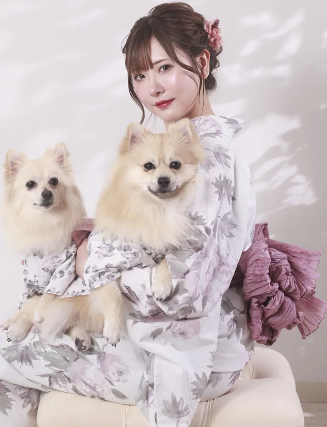 左からペット浴衣(ピンクLサイズ、2Lサイズ)、レディース浴衣(ピンク) 着用