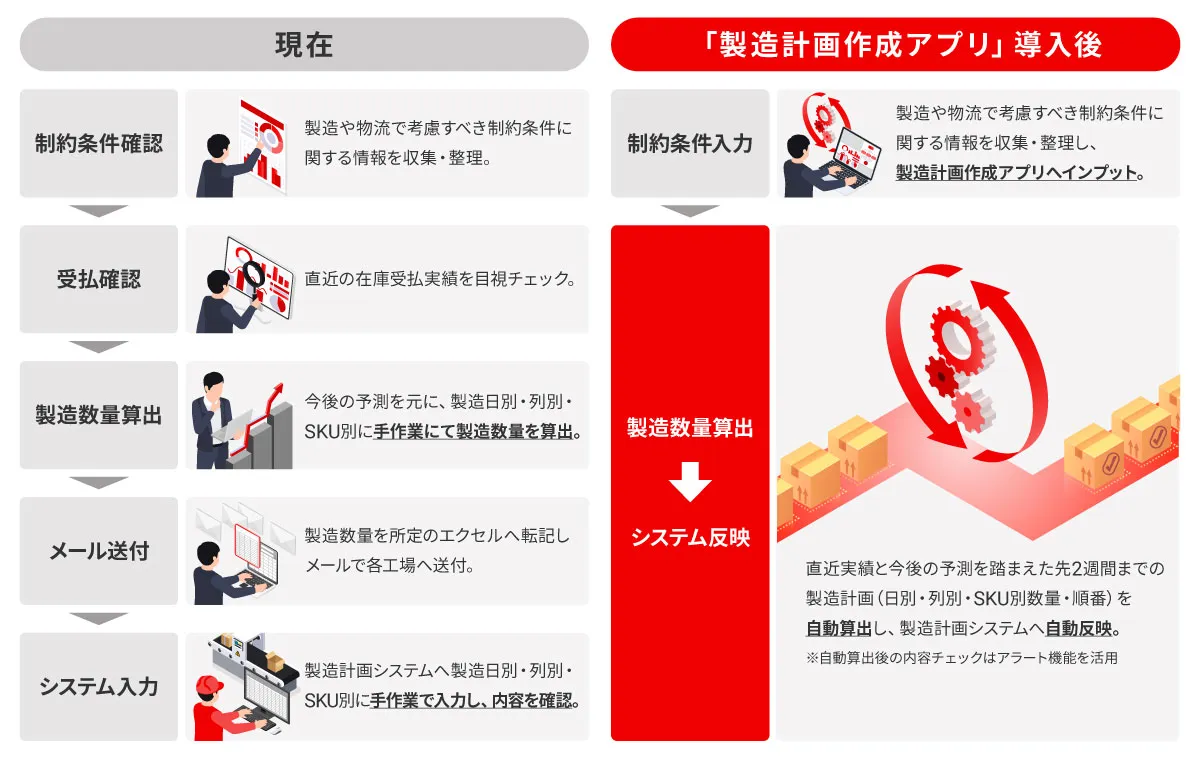 製造計画作成業務は、直近1~2週間先や数ヶ月先の製造計画を作成した上で、最終的には足元の出荷動向をふまえた日々の製造数の調整・確定を行っていますが、今回の「製造計画作成アプリ」はその中の直近1~2週間先の製造数量を算出するアプリです。