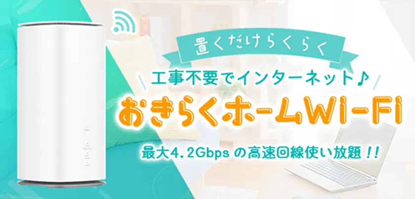 おきらくホームWi-Fiは、回線引き込み工事をする事なくインターネット接続を可能にする「ホームルーター」をレンタル提供するサービスです。