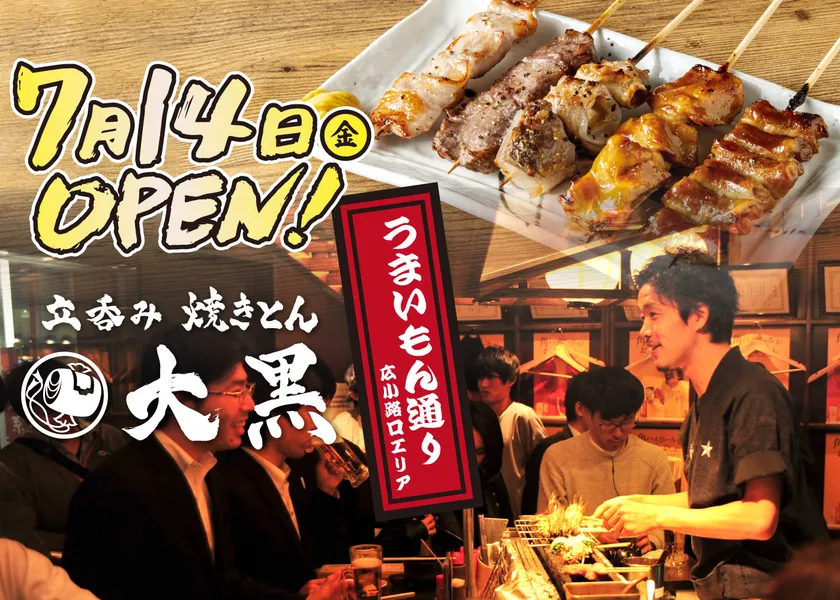 名古屋、関東、広島のサラリーマンに人気の立ち飲み居酒屋「焼きとん 大黒」「立呑み 魚椿」を運営する光フードサービス株式会社(所在地:愛知県名古屋市、代表:大谷 光徳)は、2023年7月14日(金)に「焼きとん 大黒」を名古屋駅構内 うまいもん通り広小路口にオープンいたします。