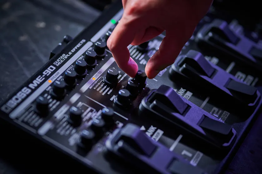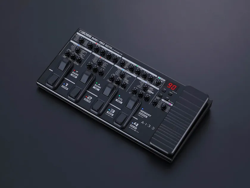 今回発表する『ME-90』は、コンパクト・エフェクターのような直感的な操作性と、マルチ・エフェクターならではの緻密な音作りを実現するボス「ME」シリーズの最新モデルです。エフェクトごとに独立したパラメーター・ノブと8つのフットスイッチを装備し、それぞれのエフェクトを直感的にコントロールすることが可能です。ボス(BOSS)のマルチ・エフェクターのフラッグシップ・モデル「GT-1000」から受け継いだエフェクトとプリアンプで音作りを行うことができます。SEND/RETURN端子の追加やIRデータへの対応、軽量化など、大幅なアップデートが施されています。