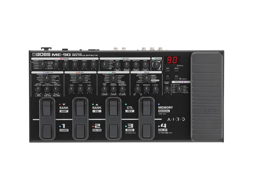 『ME-90』は、サンプリング・レート48kHz、AD/DA変換24bit、内部演算32bit float(浮動小数点)処理による高品位な音質を実現。ボスのマルチ・エフェクターのフラッグシップ・モデルである、「GT-1000」から受け継いだ「AIRD」プリアンプと高品位なエフェクトを多数搭載しています。真空管アンプさながらのサウンドと生々しいレスポンスを実現する「AIRD」プリアンプは、クラッシックなコンボ、ハイゲインなスタック、BOSSオリジナルのタイプなど全11種類のアンプを搭載。エフェクトは、定番のオーバー・ドライブ、ディストーション、コーラス、ディレイ、リバーブをはじめ、アコースティック・シミュレーターやルーパーなど、全60種類を搭載。さまざまなプレイ・スタイルに対応することができます。