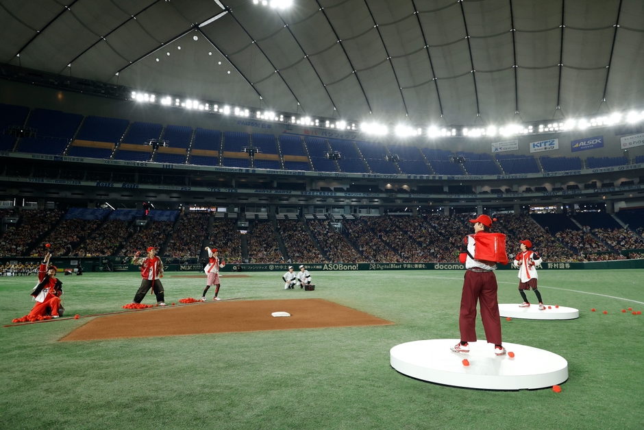 15時30分からGS、BW、DBの順番でウォーミングアップが行われた。ウグイス嬢のアナウンスで各チームのメンバーが元気よくグラウンドに飛び出し、ノックを受けたり、打撃練習を行ったりして、東京ドームの感触を確かめた。