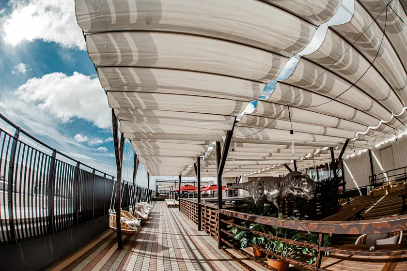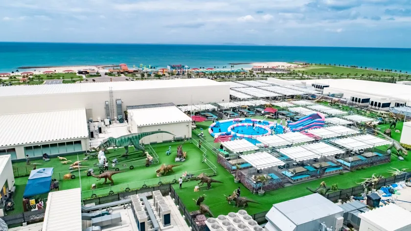【epica BBQ beach club】の会場、ダイナソー BBQ&パーク「STEM RESORT」は、イーアス沖縄豊崎の屋上にある2,500坪の日本最大級の屋上BBQパーク!巨大ダイナソーパーク・巨大プール・ボールプレイランド・幼児用プレイランド・ピンク滑り台(すべり台)・ピンクカフェなど、お子様向けのテーマパーク施設になります。