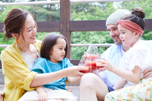 本プランで泊まるのは野菜をテーマにした客室「ベジルーム」です。野菜のクッションや図鑑、絵本、野菜のぬりえ(制作:カゴメ)など、野菜をテーマにしたグッズが並びます。ウェルカムドリンクは、今年収穫した国産完熟トマトを使用した「カゴメトマトジュースプレミアム」(夏限定発売)です。客室に用意している、フレアした飲み口が特徴のリゾナーレ八ヶ岳オリジナルワイングラスに注いで飲むと、ジュースが舌先に触れてから喉の奥へと通り、さらっとしたのどごしと、トマトの爽やかな香りをより楽しめます。また、プラン専用の野菜セラーに用意するのは、カットした野菜を冷たいソースにつけて食べる「バーニャフレッダ」です。カゴメ野菜生活ファーム富士見で収穫した野菜を中心に、彩り豊かな旬の野菜を、塩やオリーブオイルやホテル特製ディップソースをつけて気軽に食べられます。また、カゴメ野菜生活ファーム富士見オリジナルのトートバッグも客室に用意するので、これを持って本プランと同時開催中の「八ヶ岳マルシェ2021」(*3)へ野菜を買いに出かけるのもおすすめです。