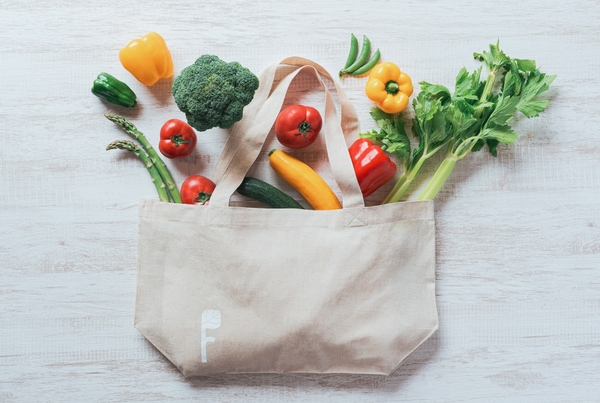 9:00 カゴメ野菜生活ファーム富士見オリジナルのトートバッグを持って八ヶ岳マルシェでお買い物