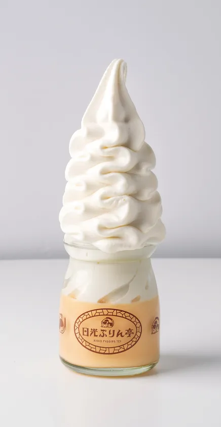 栃木県産の牛乳と日光御養卵を使ったしっかりとした食感のぷりんにバニラソフトクリームをのせました。