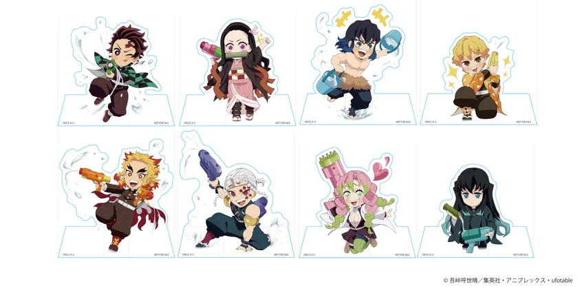 本イベントでは、主人公「炭治郎」をはじめ「禰豆子」「善逸」「伊之助」「煉獄」「宇髄」「蜜璃」「無一郎」ら8人のイベント限定ufotable描き下ろしイラストが登場。水鉄砲を持った夏らしい描き下ろしとなっております。