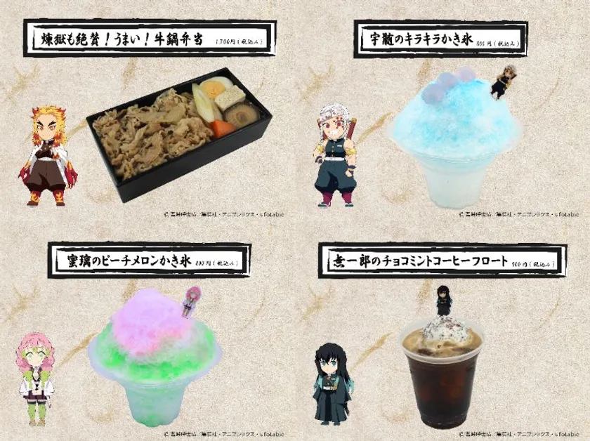 炭治郎たちをイメージした多彩なフードをご用意。夏にぴったりなかき氷やフロートの他、お腹を満たせるメニューも充実しております。