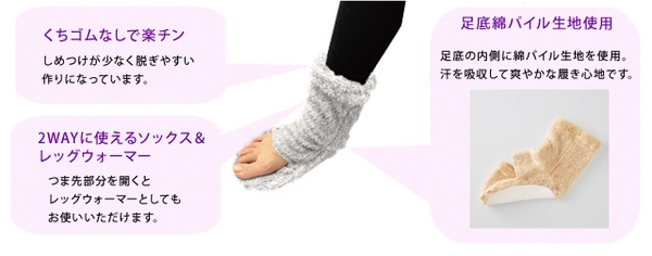 本商品はくちゴムなしの暖かボア靴下で、つま先部分が開く設計にすることで、ムレやすい足先を開放して熱を逃がします。また足底に肌触りの良い綿パイル生地を使用し、汗をかいてもサラサラで暖かな履き心地です。紳士用・婦人用の2サイズ展開があります。寒い日の夜も、おやすみタイム専用靴下「おやすみソックス」が足元を快適にあたためます。