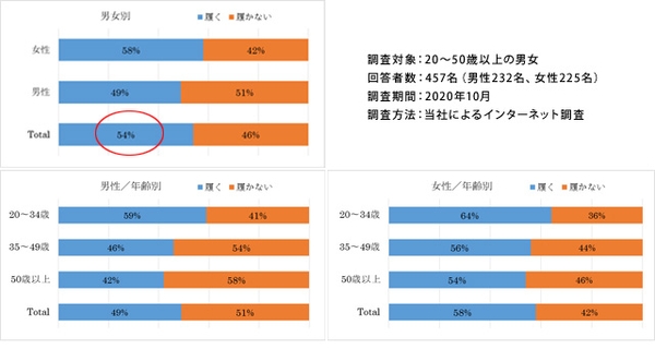 グンゼで寒い日の就寝時に靴下を履くか履かないかのアンケート調査を行ったところ、「靴下を履く」と答えた方は54%で「履かない」と答えた方を上回る結果になりました。また、女性の方が男性よりも靴下を履く割合が高く、男女ともに年齢が下がるほど靴下を履いて寝る傾向が高いことがわかりました。
