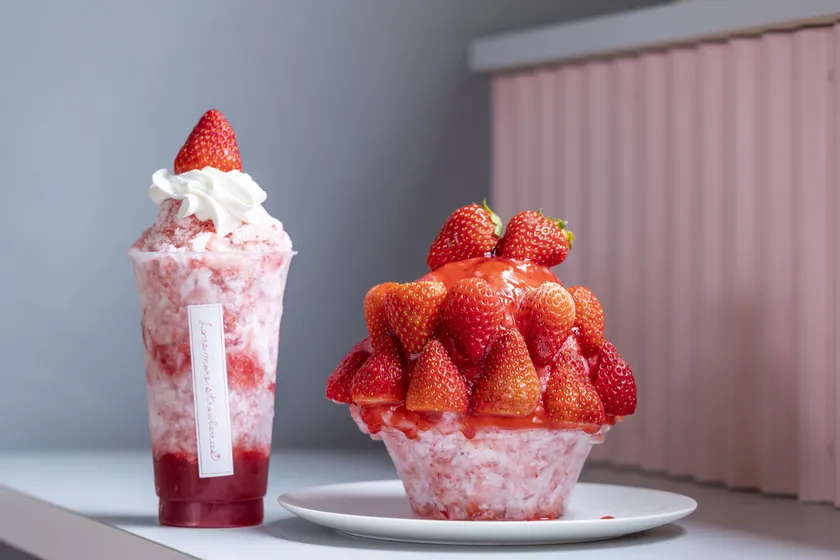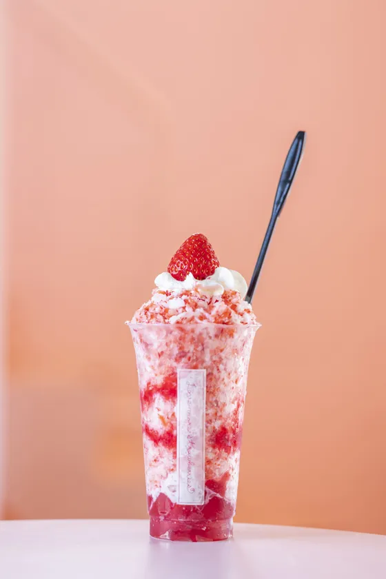 オリジナルの削りいちごをメインに、かき氷のために作ったいちごの果肉感のあるとろとろいちごソースをたっぷりかけて仕上げました。削りいちごは急速冷凍した静岡県産の“丸ごといちご”と“濃厚ミルク氷”を一緒に削ることで、いちごの甘酸っぱさとミルクのまろやかな味わいが絶妙にマッチしています。爽やかな酸味がおいしい夏いちごも7粒トッピング!最初から最後までいちごをしっかり味わえるかき氷です。