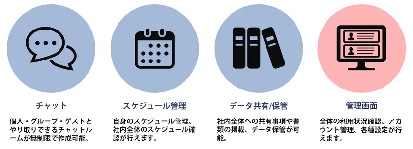 管理画面では一括でアカウントの管理、利用状況の確認が行えるので、ツールが個人管理になる心配はありません。また、本製品内でのやり取りは全て暗号化通信でやり取りされており、セキュリティ対策も万全の環境でご利用いただけます。