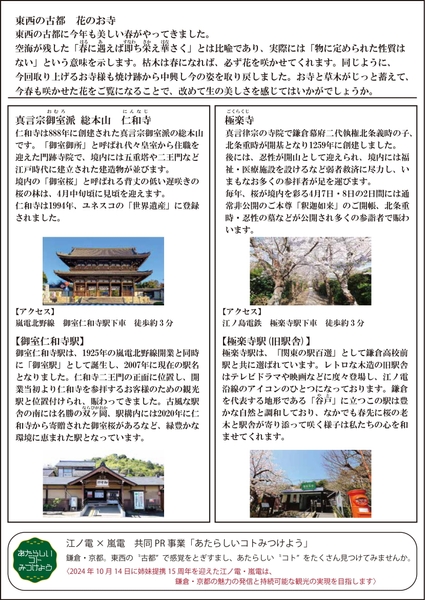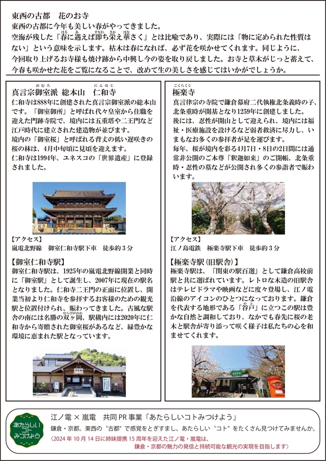 本シリーズ第4回として、古都の花のお寺とその最寄り駅の風景を紹介する「春に遇えば即ち栄え華さく ~京都 御室仁和寺、鎌倉 極楽寺」が完成、共同PRを実施します。