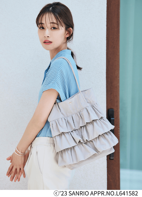 3段のティアードがフェミニンな縦型のトートバッグ。ハンドルは丸くて細いフェイクレザーになっているので、すっきりと大人っぽいデザインに。