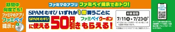 7月11日(火)から7月23日(日)までの間、ファミマのアプリ「ファミペイ」では、期間中に何度でも使えるおトクな50円引きクーポンを配布します。クーポンを利用し、おトクに「SPAM(R)むすび」をお楽しみください。