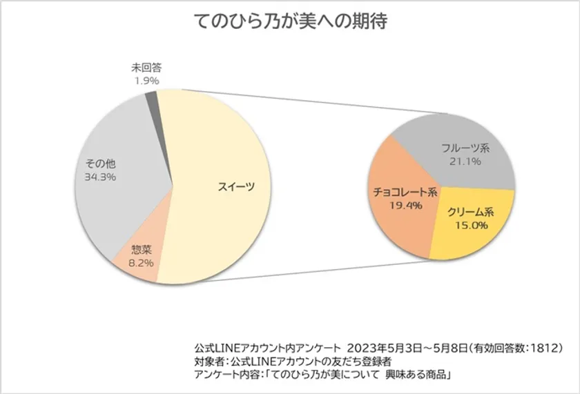乃が美が販売する「てのひら乃が美」は、手の平サイズ約7cm角のミニ「生」食パンで、2023年4月14日(金)より販売し、6月からは取り扱い店舗を拡大した乃が美の新ラインとなる食パンです。乃が美独自で2023年5月3日(水)から5月8日(月)の間に取得した公式LINEアカウント内における「てのひら乃が美」購入者に対するアンケート調査(対象1,812名)の結果、スイーツ系への期待が約55%と惣菜系への期待約8%を大きく超え、なかでもペースト系の「チョコレート系」、「クリーム系」への合わせた期待が約34%と高い数値を示したことを受け、これまでの「レモン」、「くるみ」、「チーズ」に加え、「チョコチップ」、「カスタードクリーム」を開発いたしました。