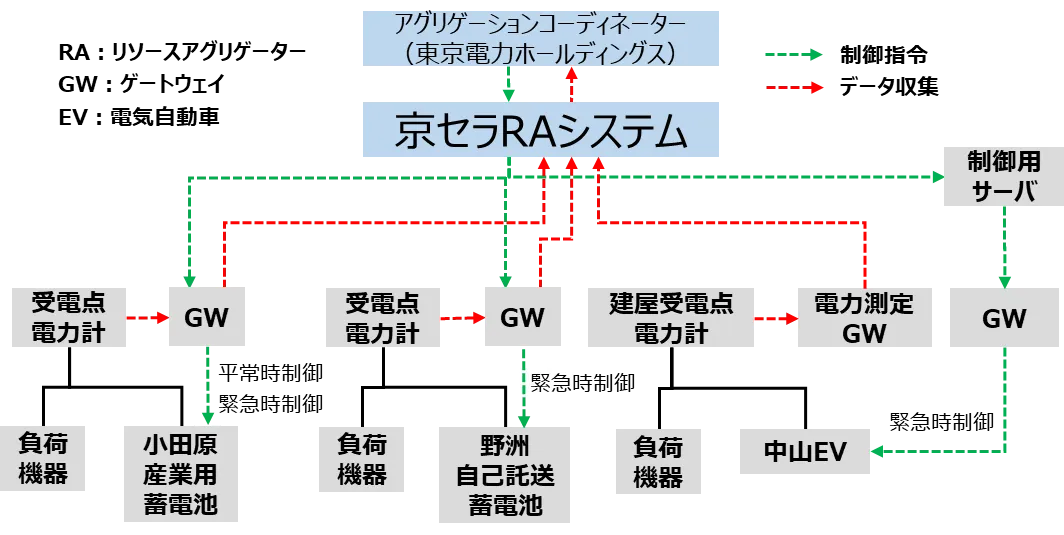 このたび、京セラ先進技術研究所にて開発したリソースアグリゲーター(RA)※5システムで、さまざまなリソースを組み合わせた実証実験を実施し、平常時の周波数制御は一部の対応可能なリソースで補い、電力系統での電力供給が不足した緊急時には全てのリソースで10秒以内に所定制御値へリソース制御を行うことで、周波数制御非対応のリソースも一次調整力として活用できることを確認しました。