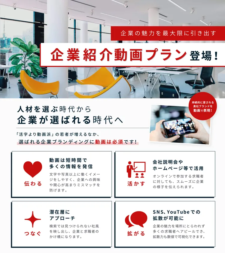 動画を活用しきれずに課題を抱える企業も多いことから、タイパ(タイムパフォーマンス)やストーリーテリングを重視した動画制作で、学校と企業採用に活用できる、ブランディングに効果的な「学校紹介動画プラン」と「企業紹介動画プラン」をリリースしました。