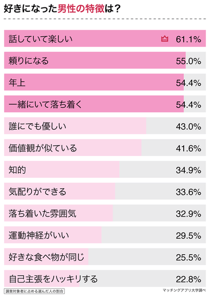 前の質問でO型女子は「大人っぽくて男らしいタイプ」の男性に惹かれる傾向があることが分かりましたが、特徴として「年上」で「頼れる」「一緒にいて楽しい・落ち着く」という点があるようです。