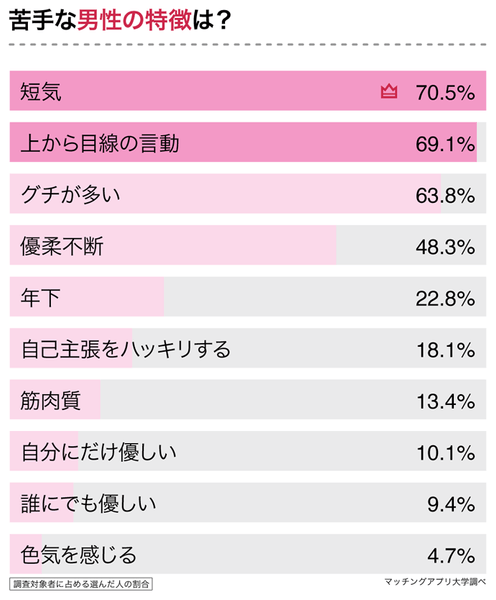 次はO型女子が「苦手」だと感じる男性の特徴についてです。1位は「短気(70.5%)」、2位は「上から目線の言動(69.1%)」で、約7割のO型女子が苦手な男性の特徴として挙げました。3位は「グチが多い(63.8%)」です。