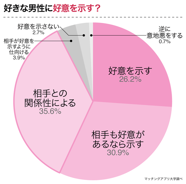 「好きな男性に好意を示す?」と聞いたところ、1位は「相手との関係性による(35.6%)」でした。2位の「相手も好意があるなら示す(30.9%)」、3位の「好意を示す(26.2%)」を合わせると、なんと合計92.7%のO型女子は相手に好意を示す可能性があることが分かりました。