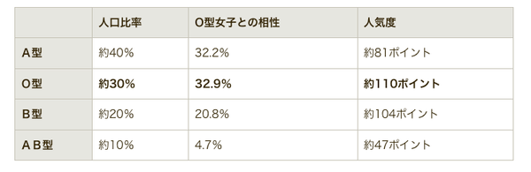 ランキングで1位のO型は、人口比率を加味しても人気度110ポイントで1位でした。3位のB型は人気度ではO型に6ポイント差で2位という結果でした。O型女子はO型とB型の男性に惹かれる傾向があるようです。