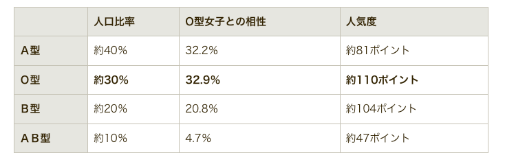 日本血液製剤協会によると、日本人における血液型の割合はA型が約40%、O型が約30%、B型が約20%、AB型が約10%であるといわれています。このアンケート結果を人口比率と比較し、人気度を算出したのが上記の表です。