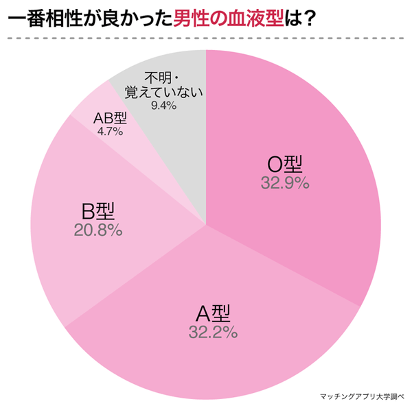 最後に「今までに付き合った男性の中で一番相性が良いと思った男性の血液型は?」と聞いたところ、1位は「O型(32.9%)」、2位は「A型(32.2%)」、3位は「B型(20.8%)」、4位は「AB型(4.7%)」でした。