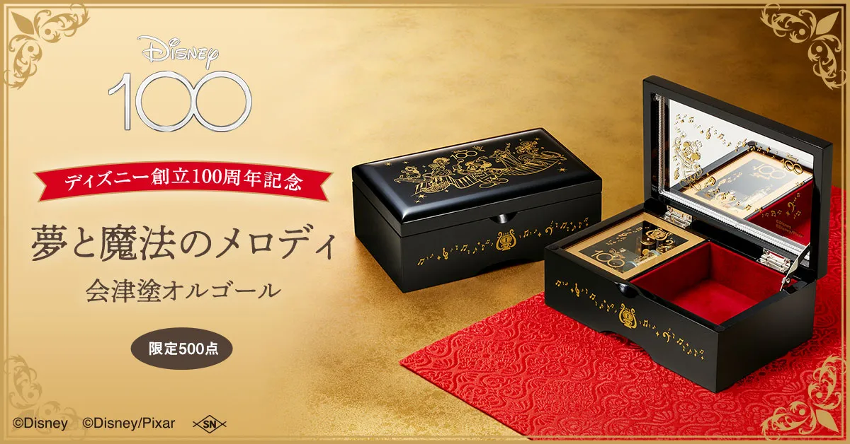 ディズニー創立100周年記念<夢と魔法のメロディ>会津塗オルゴール新発売!ディズニーの人気者たちが、きらびやかな金彩の蒔絵で浮かび上がります