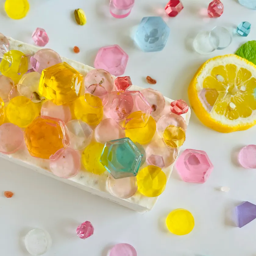 今回夏バージョンで新登場するのは、レモンと白桃、九州産のすももを贅沢にクリームに合わせた【宝石のカッサータ~ピーチシトラス~】。イタリア発祥のアイスケーキカッサータにハラペコラボオリジナルの宝石のような琥珀糖を散りばめて豪華に仕上げました。黄色はレモン味、ピンクはピーチココナッツ味の琥珀糖です。