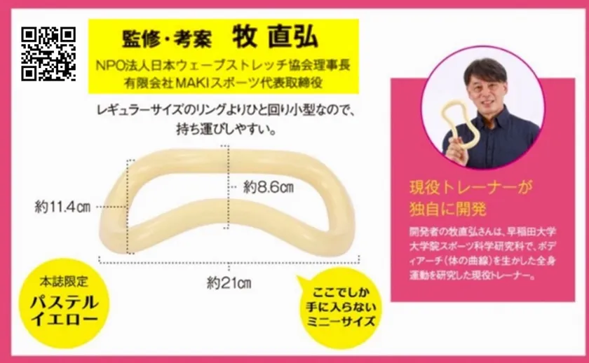 NPO法人日本ウェーブストレッチ協会の理事長である牧直弘氏は、長年の武術とダンスの経験を通じて独自のボディアーチ理論を生み出し、2005年に「ウェーブストレッチリング(通常版)」を発明・開発しました。今回の「入門編ミニリング」も牧直弘氏の監修です。2020年に早稲田大学院スポーツ科学学科で身体理論を学び、2022年には「薬指の第一関節だけで変わる全身連動メソッド!」(BABジャパン社)を執筆。そのメソッドのガォ体操は、薬指の第一関節にリングを引っ掛けながら胸郭アップで、人間本来のボディアーチを再構築し理想的な姿勢と機能的な動きを可能にします。「入門編ミニリング」の冊子にも、最新メソッドのガォ体操も詳しく紹介されています