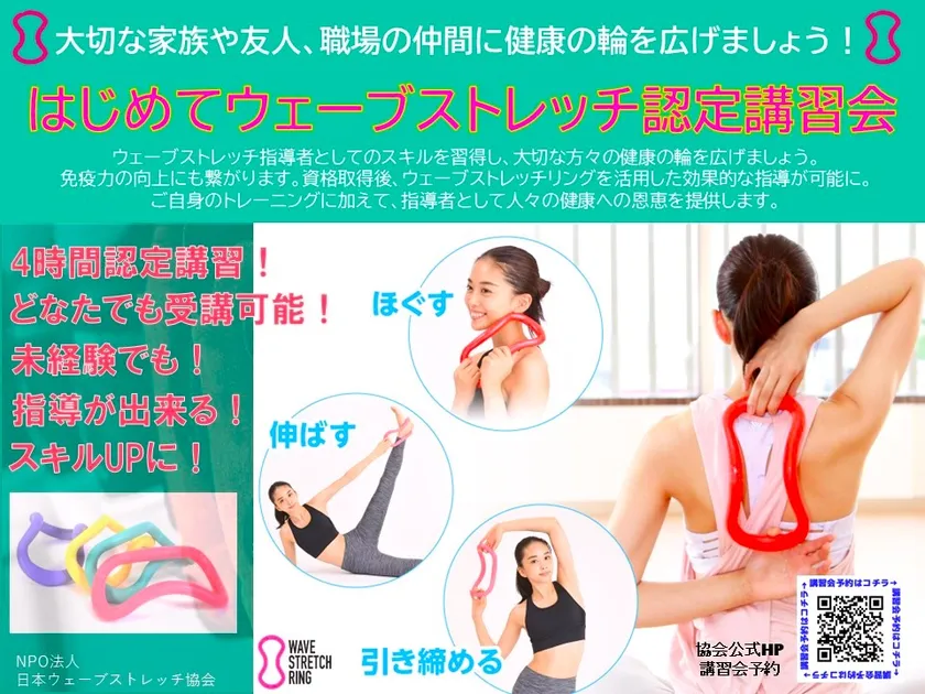 一般の方でも「はじめてウェーブストレッチ認定講習会(4時間)」を受講することで、ウェーブストレッチリングを使った指導が家族や会社でもできます。