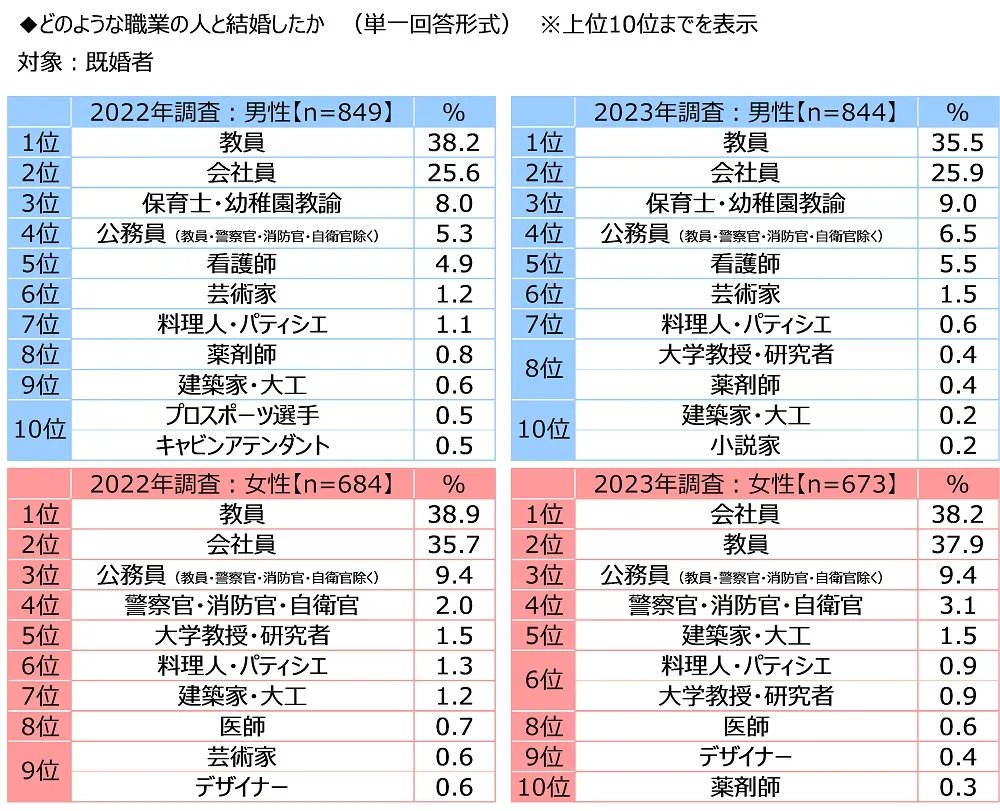 ・どのような職業の人と結婚した? 男性1位は「教員」、女性1位は「会社員」