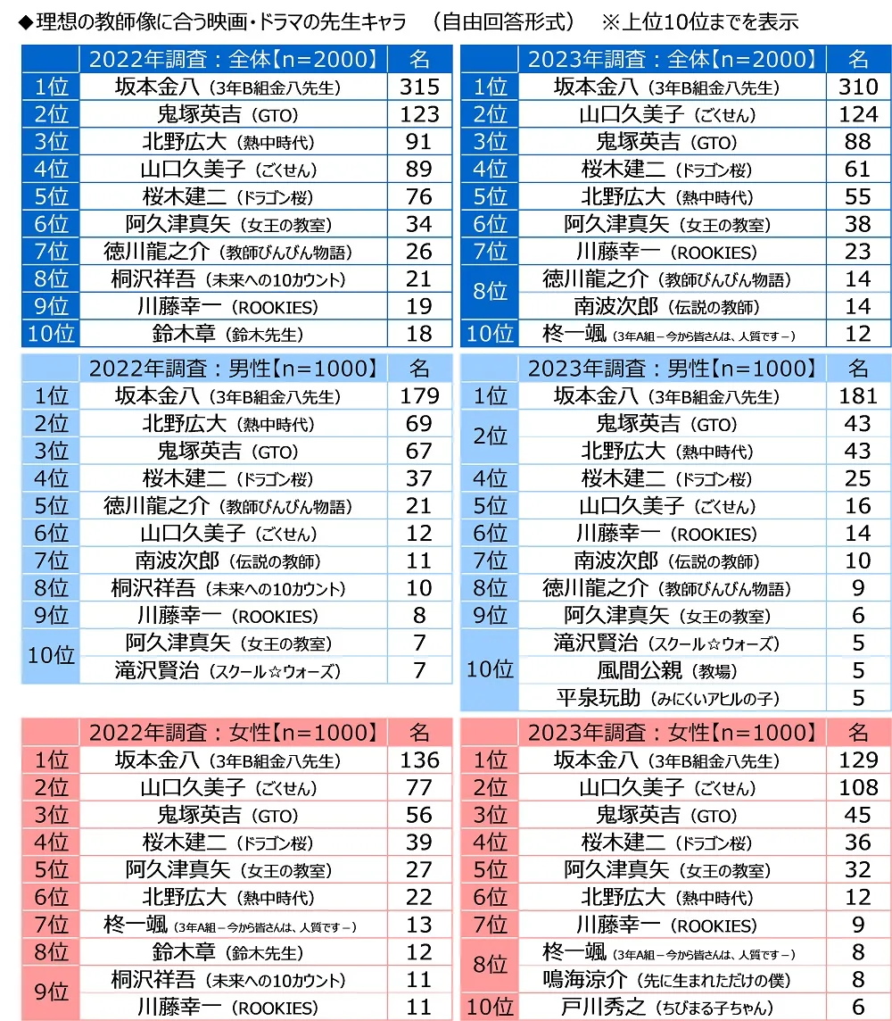 男女別にみると、男女とも1位は「坂本金八(3年B組金八先生)」(男性181名、女性129名)となり、男性では2位「鬼塚英吉(GTO)」「北野広大(熱中時代)」(いずれも43名)、4位「桜木建二(ドラゴン桜)」(25名)、5位「山口久美子(ごくせん)」(16名)、女性では2位「山口久美子(ごくせん)」(108名)、3位「鬼塚英吉(GTO)」(45名)、4位「桜木建二(ドラゴン桜)」(36名)、5位「阿久津真矢(女王の教室)」(32名)と続きました。