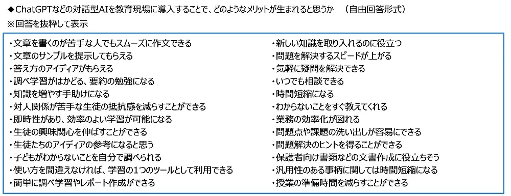 また、「いつでも相談できる」や「時間短縮になる」、「わからないことをすぐ教えてくれる」、「業務の効率化が図れる」、「問題点や課題の洗い出しが容易にできる」、「問題解決のヒントを得ることができる」、「保護者向け書類などの文書作成に役立ちそう」、「汎用性のある事柄に関しては時間短縮になる」、「授業の準備時間を減らすことができる」など、業務効率化が図れる点をメリットに感じている回答も多く挙げられました。