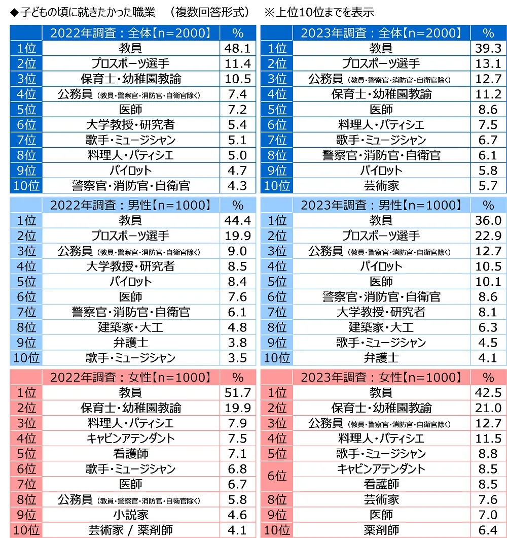 男女別にみると、男女とも1位は「教員」(男性36.0%、女性42.5%)となり、男性では2位「プロスポーツ選手」(22.9%)、3位「公務員(教員・警察官・消防官・自衛官除く)」(12.7%)、4位「パイロット」(10.5%)、5位「医師」(10.1%)、女性では2位「保育士・幼稚園教諭」(21.0%)、3位「公務員(教員・警察官・消防官・自衛官除く)」(12.7%)、4位「料理人・パティシエ」(11.5%)、5位「歌手・ミュージシャン」(8.8%)でした。