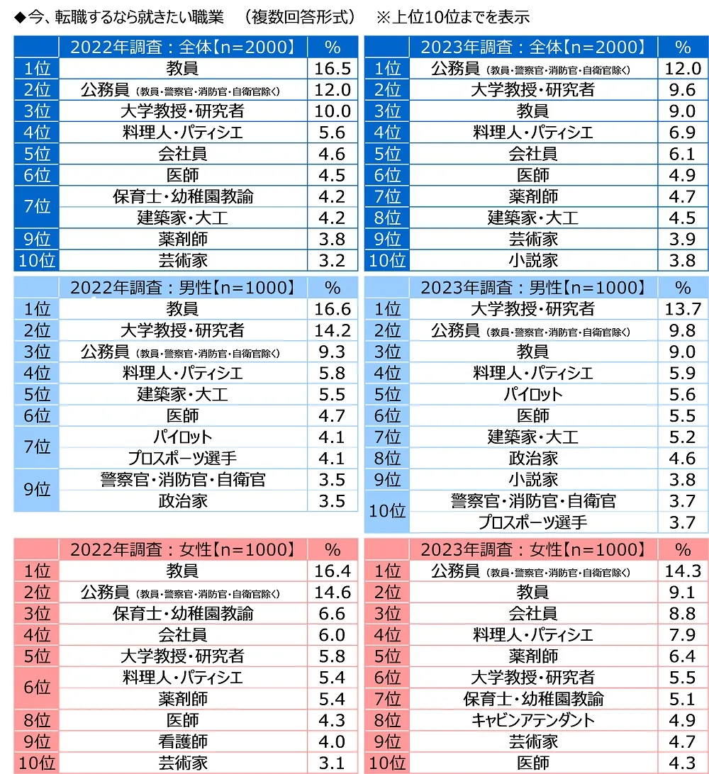 前回の調査結果と比較すると、「教員」は1位(2022年16.5%)から3位(2023年9.0%)に順位を下げたのに対し、「公務員(教員・警察官・消防官・自衛官除く)」は2位(2022年12.0%)から1位(2023年12.0%)、「大学教授・研究者」は3位(2022年10.0%)から2位(2023年9.6%)にそれぞれ順位を上げる結果となりました。