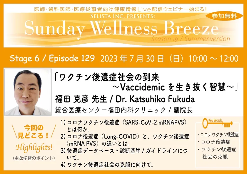 セリスタ株式会社(東京都千代田区、代表取締役:伊藤 承正)は、2023年7月30日(日)に、統合医療分野の研究と臨床における第一人者の福田 克彦先生(統合医療センター福田内科クリニック/副院長)を講師に迎え、医師・歯科医師・薬剤師・医療従事者限定の無料Zoomオンラインセミナー『ワクチン後遺症社会の到来 ~Vaccidemicを生き抜く智慧~』を開催します。