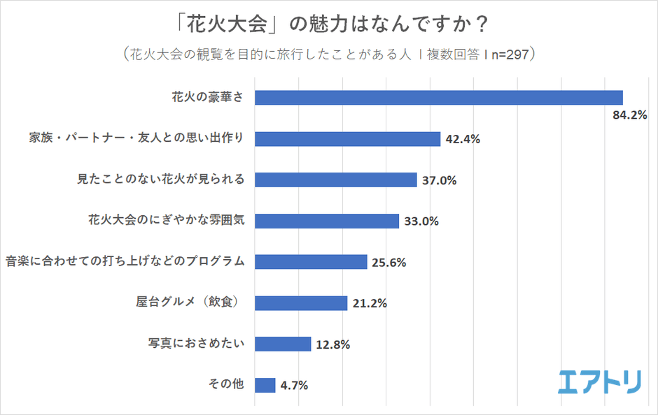 花火大会の魅力は「花火の豪華さ」(84.2%)、次いで「家族・パートナー・友人との思い出作り」(42.4%)、「見たことのない花火が見られる」(37.0%)という回答でした。