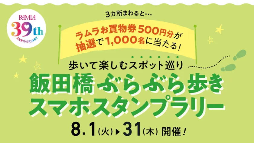 同時に、東京大神宮~ラムラ~毘沙門天善國寺を巡ると抽選で買物券が当たる「飯田橋ぶらぶら歩きスマホスタンプラリー」(8月1日~8月31日)を実施し、地域の賑わい創出に努めてまいります。