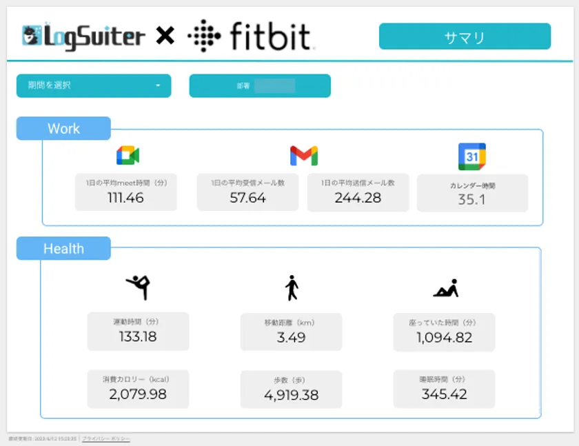 「LogSuiter for Fitbit」では、Google Workspace の働き方に関する データに対して、Fitbit 製品から取得するヘルスデータを組み合わせ可視化することで、健康経営の推進を支援することを目的としたサービスです。