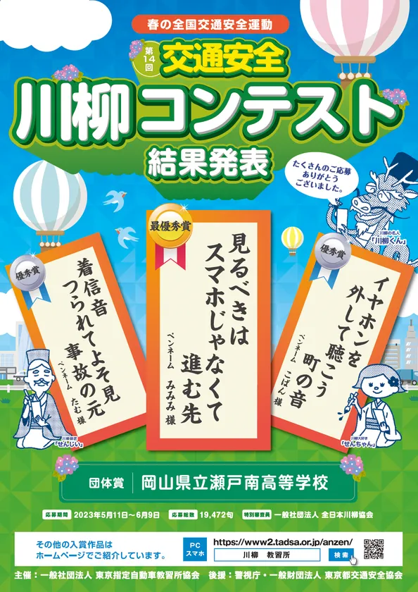 同コンテストは、春の全国交通安全運動の一環として交通安全の啓蒙を呼び掛けることを目的に、交通安全にまつわる川柳を、インターネット、葉書、都内の指定自動車教習所窓口で募集を行い、総数19,472句の作品が全国47都道府県から寄せられました。