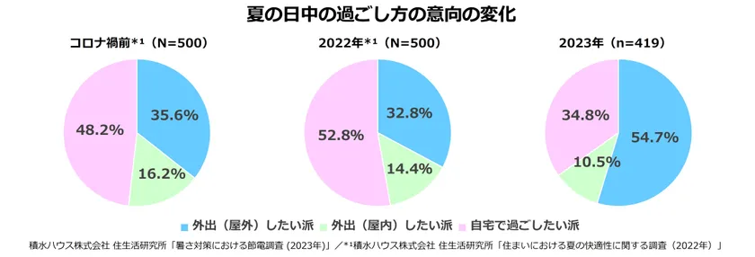 2023年の夏(以降、今年の夏)は、2023年5月より新型コロナウイルス感染症が5類感染症へ移行したことを受け、コロナ禍後の外出制限が求められなくなったこともあり、日中の過ごし方の意向で「外出(屋外)したい派」は54.7%でした。これは、昨年の夏(2022年に実施した「住まいにおける夏の快適性に関する調査」*1より)と比較し20ポイント以上増えました。また、コロナ禍前の意向と比較しても20ポイント近く増える結果となりました。