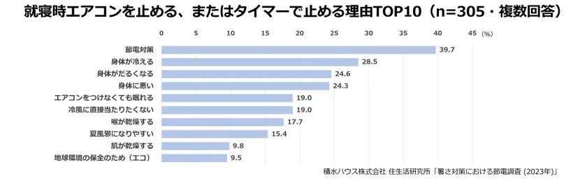 就寝中のエアコンの稼働実態について詳しくみてみると、おやすみモードの利用も含め、一晩中エアコンをつけている人は38.4%で、タイマーを使用して数時間で切る人は37.2%、就寝時にエアコンをつけない人は23.8%になりました。就寝時エアコンを止める、またはタイマーで止める理由としては「節電対策」39.7%が最も多く、次いで「身体が冷える」28.5%、「身体がだるくなる」24.6%、「身体に悪い」24.3%と続き、身体に対する影響が多く見受けられました。