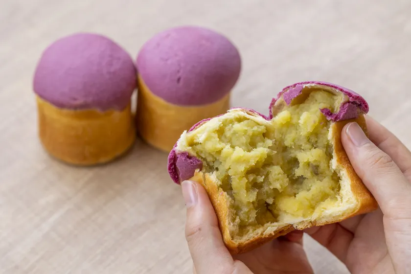一日に最高2,031個も販売した実績のある当店でも人気の高い商品です。紫色の帽子をかぶったような見た目をしており、中には鳴門金時芋を使用したお芋餡がぎっしりと詰まっています。見た目以上にずっしりと重たく、おいものほくほく感と繊維感を味わえる、お芋の魅力を詰め込んだ逸品です。製造数に数限りがあるため、1時間に1回できたてを数量限定販売しています。