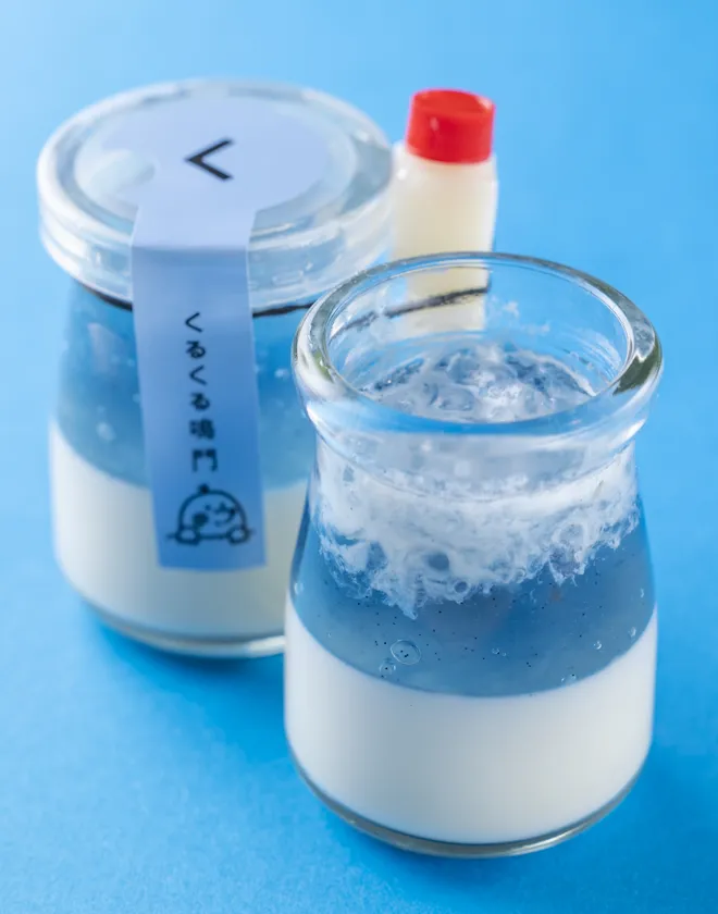 ミルクプリンの上にラムネジュレをのせた青と白の2層が可愛らしいプリンです。鳴門産の塩を使用した、付属の塩ミルクソースを入れてスプーンでくるくると混ぜると渦潮のような見た目になります。見て楽しい食べて美味しい、ユニークな商品に仕上げております。爽やかな夏にぴったりの逸品です。