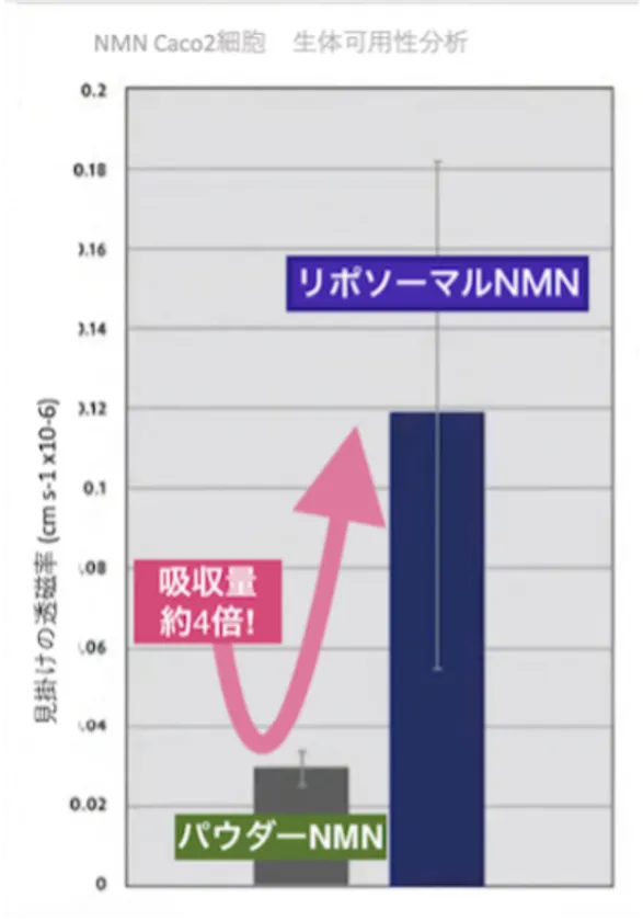 ナノリポソームでのNMNは、パウダーでのNMNと比較して約4倍もの体内での吸収量を誇り、高いバイオアベイラビリティを実現しています。