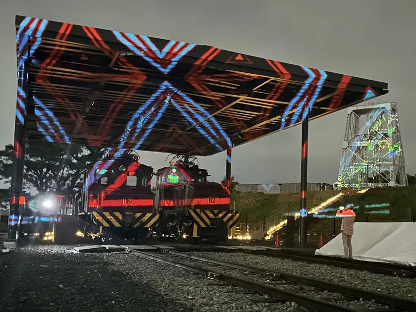 夜に実施した、炭鉱電車を彩るプロジェクションマッピング(1)
