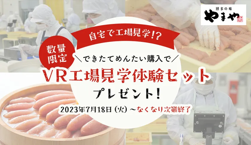 株式会社やまやコミュニケーションズ(本社:福岡県糟屋郡篠栗町、代表取締役社長:山本 正秀、以下 やまや)は、2023年7月18日(火)より、やまや公式アプリをダウンロードいただいた方限定でVR工場見学体験セット付きの「できたてめんたい」を発売いたします。※数量限定